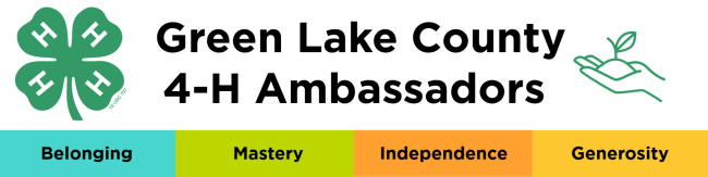 Green Lake County 4-H Ambassadors are the youth leaders that represent Green Lake County. By becoming a Green Lake County 4-H Ambassador, you are dedicating time and energy into supporting the county 4-H program all while learning the skills needed to be leader. Ambassadors is for youth in 6th grade or older.
