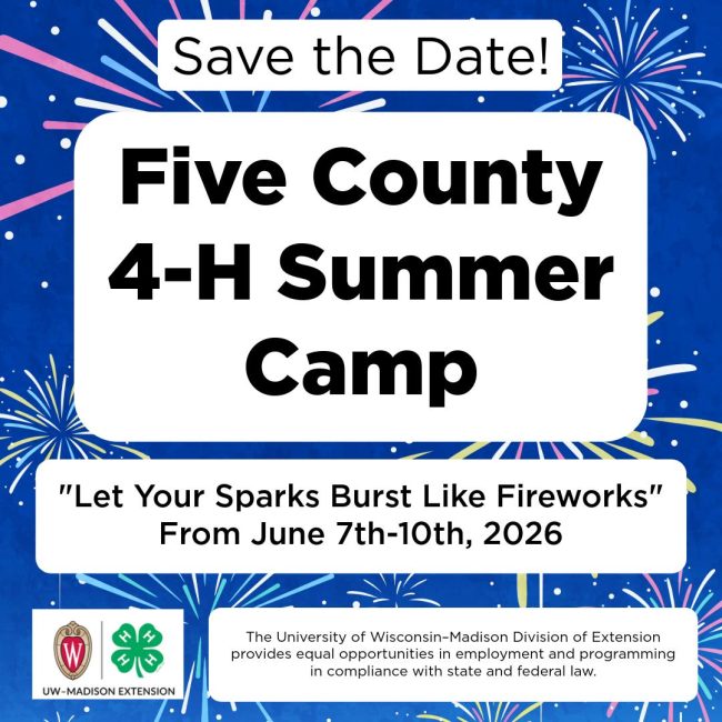 Five County 4-H Camp will be returning to Camp Lakotah in Wautoma for a bright time on June 7-10th! This is a great chance to challenge yourself to new and exciting activities like canoeing, service learning, crafts, and more!